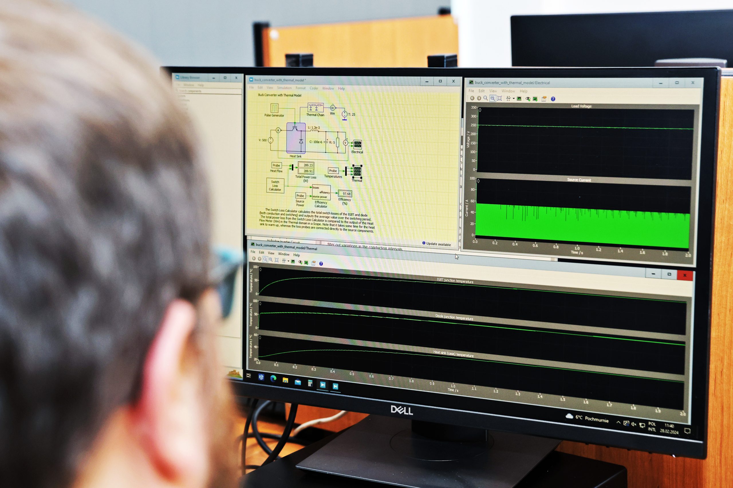 Ćwiczenia przewidziane w ramach zajęć na Pracowni Energoelektroniki realizowane są w dwóch blokach: symulacji numerycznych wybranych topologii przekształtników DC/DC i DC/AC oraz badań ekspeymentalnych podczas których Studenci dokonują pomiarów chwilowych wartości napięć i prądów w przekształtnikach z wykorzystaniem cyfrowych oscyloskopów.