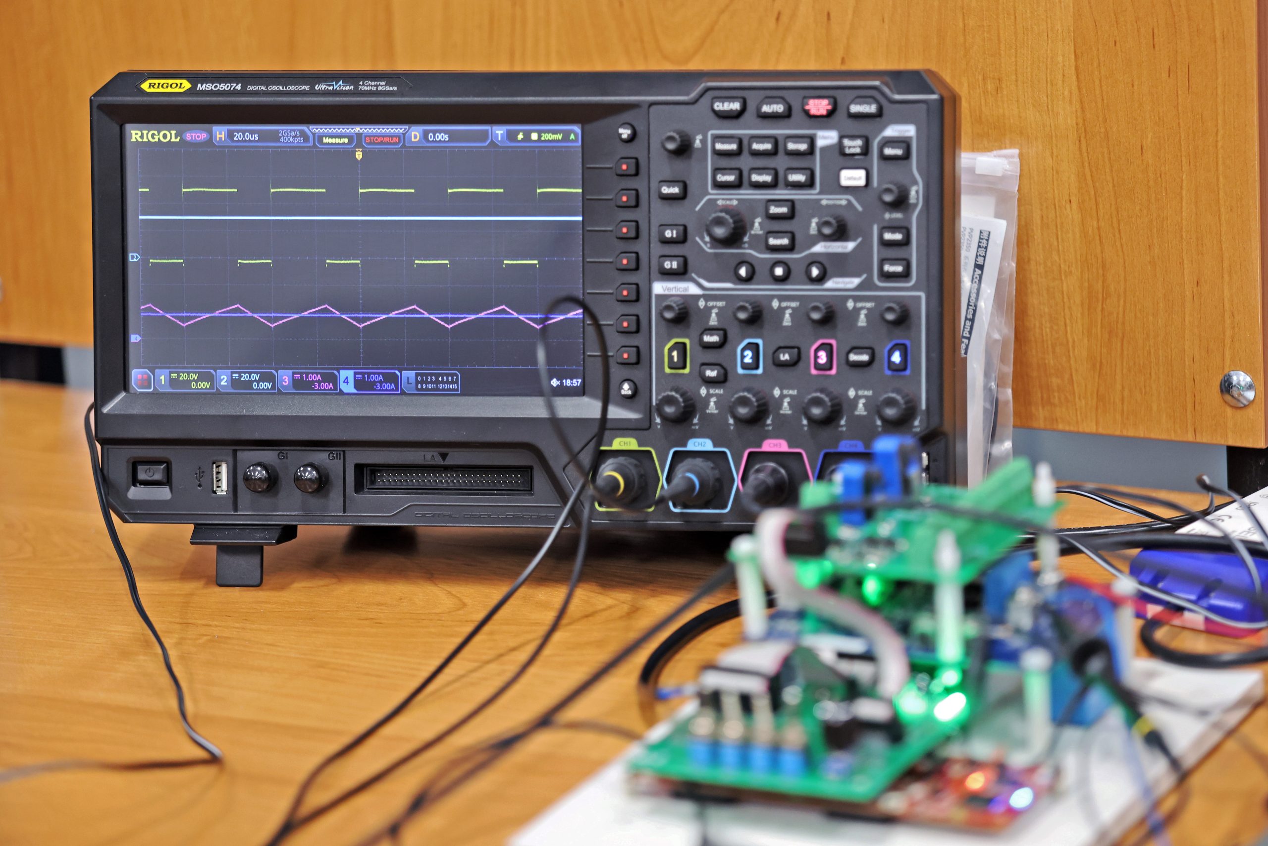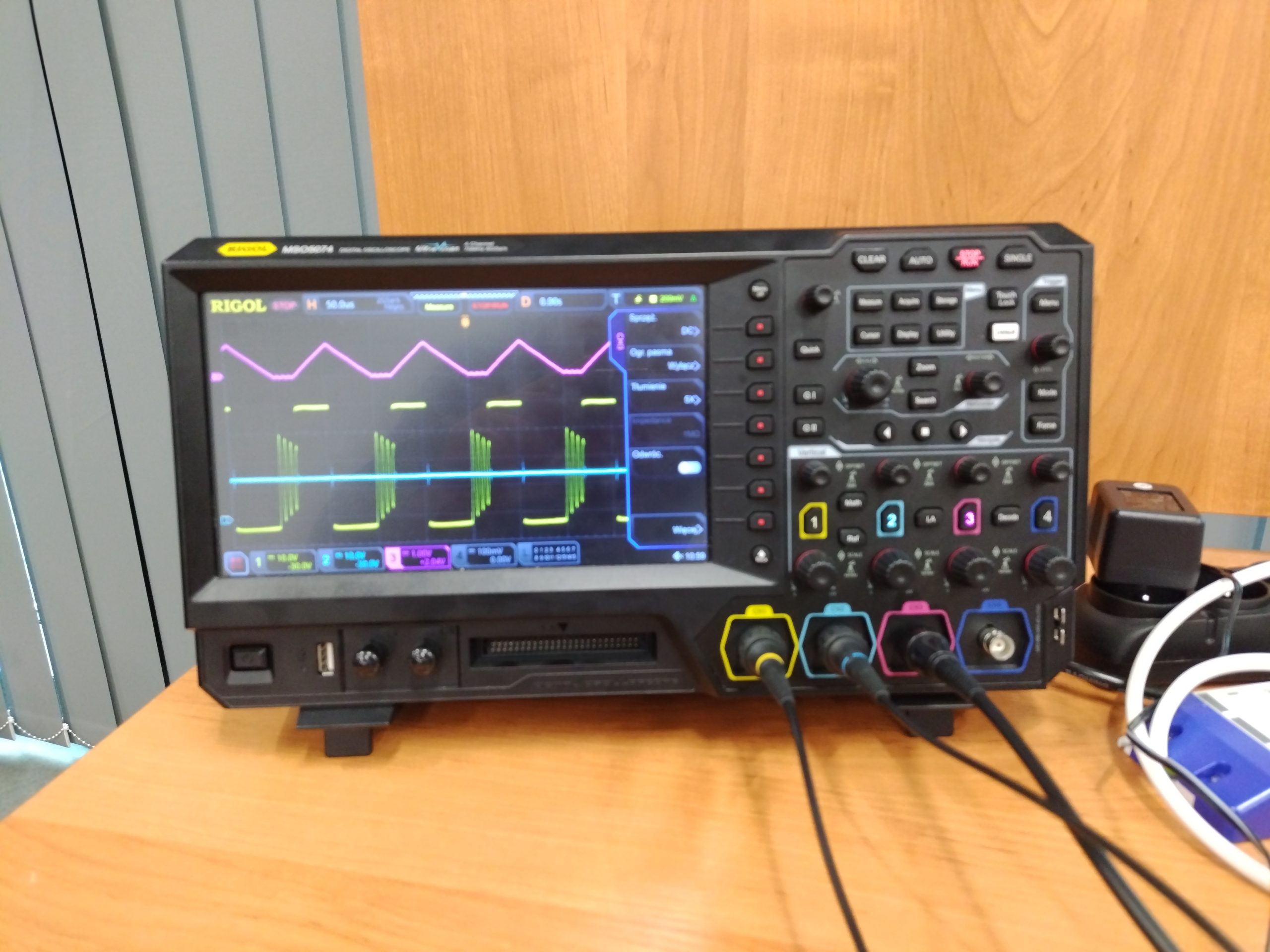 - Czterokanałowe oscyloskopy cyfrowe RIGOL MSO5074 z sondami pomiarowymi napięcia (RIGOL PVP2350) oraz prądu (Pintek PA-665 oraz PA-699);