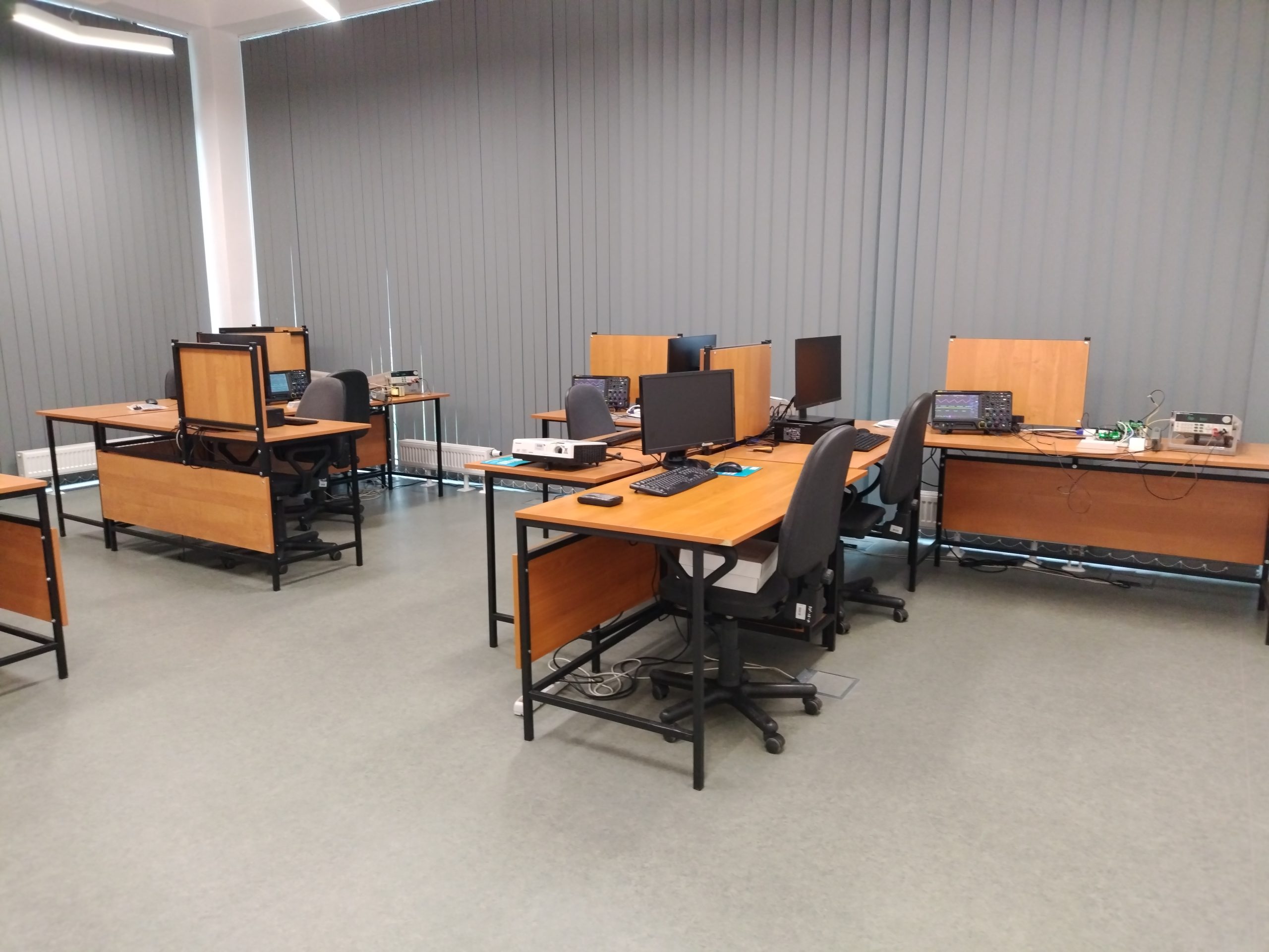 Pierwsza część laboratorium obejmuje przygotowanie modeli symulacyjnych przkształtników w środowisku Plexim PLECS oraz analizy ich pracy za pomocą wygenerowanych numerycznie przebiegów wybranych sygnałów prądowych oraz napięciowych. Druga część zajęć obejmuje fizyczne pomiary sygnałów napięcia oraz prądu na stanowiskach eksperymentalnych, które wyposazone są w: