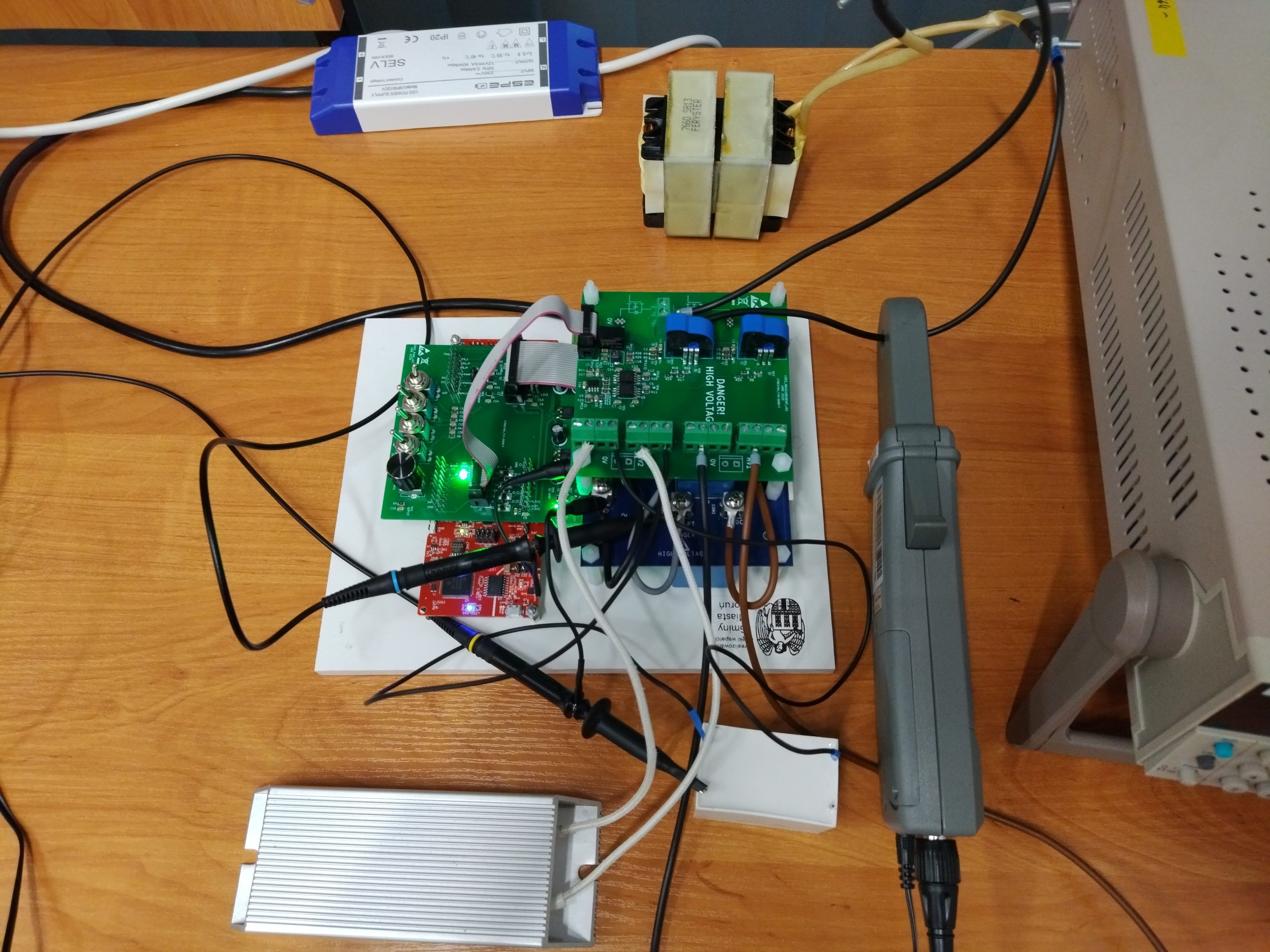 - Stanowisko z jednofazowym mostkowym falownikiem napięcia z tranzystorami SiC MOSFET C3M0120090J oraz płytką mikroprocesorową LAUNCHXL-F280049C wyposażoną w mikrokontroler Texas Instruments Piccolo F28004x z rodziny C2000;